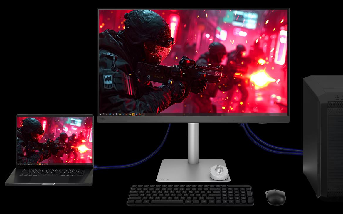 La Palette de touches de raccourci BenQ simplifie le contrôle du moniteur avec la synchronisation Display Pilot 2, vous permettant de configurer directement des fonctions de raccourci. Elle offre trois touches personnalisables pour un accès rapide au Mode couleur, à l'Entrée, à DualView, KVM, ou aux lancements d'applications. Le cadran de rotation permet un contrôle précis de la luminosité, du contraste et du volume, sans besoin de menus. Idéal pour les créatifs, il vous aide à rester concentré sans interruptions.
