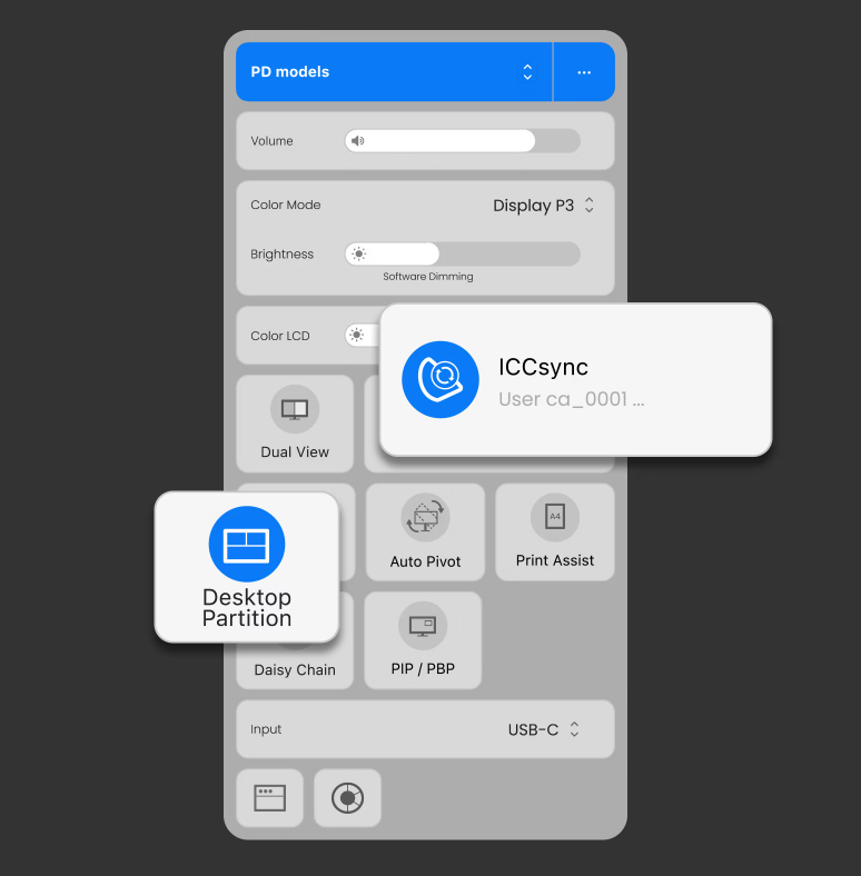 Le logiciel gratuit BenQ Display Pilot 2 vous donne le contrôle de votre affichage, vous permettant d'organiser des fonctions telles que ICCsync, Modes de Couleur et Partition de Bureau, améliorant ainsi la commodité et la flexibilité dans vos tâches de conception