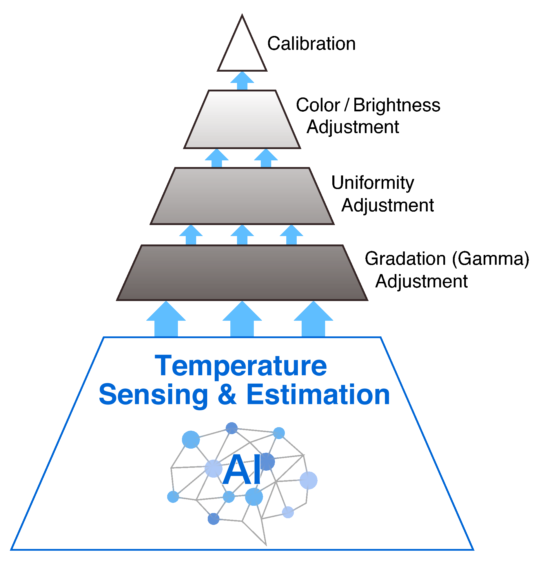 La couleur et la luminosité d'un moniteur LCD peuvent varier en raison des changements de température ambiante et de la température du moniteur lui-même. Les moniteurs de la série ColorEdge CG sont équipés d'un capteur de température permettant de mesurer avec précision la température à l'intérieur du moniteur, ainsi que d'estimer la température de l'environnement. Grâce à cette technologie de détection et d'estimation de la température, le moniteur s'ajuste en temps réel afin que les gradations, la couleur, la luminosité et d'autres caractéristiques continuent d'être affichées avec précision. De plus, EIZO utilise l'IA (intelligence artificielle)* dans l'algorithme d'estimation du CG2700S afin qu'il puisse distinguer les différents modèles de changement de température pour calculer une correction encore plus précise.