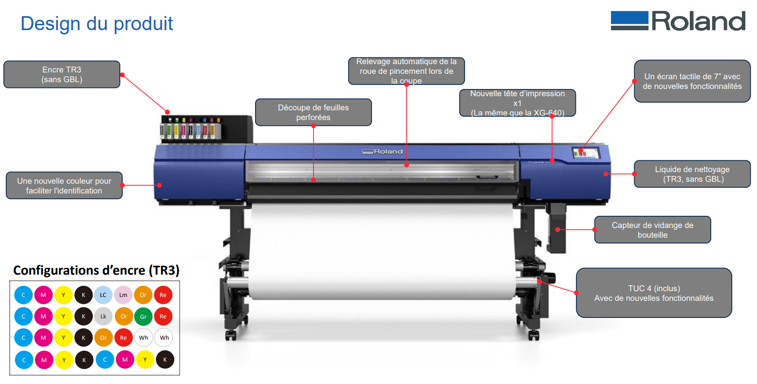 | Éléments inclus | Pied, enrouleur, porte-rouleau, câbles, lame de rechange, liquide de nettoyage, flacon de vidange, logiciels VersaWorks & Roland DG Connect | |